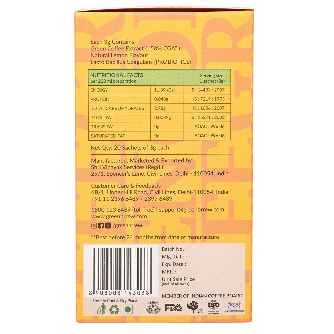 Ingredients: Green Coffee Extract ('50% CGA"), Natural Lemon Flavour, Lacto Bacillus Coagulans (Probiotics).
