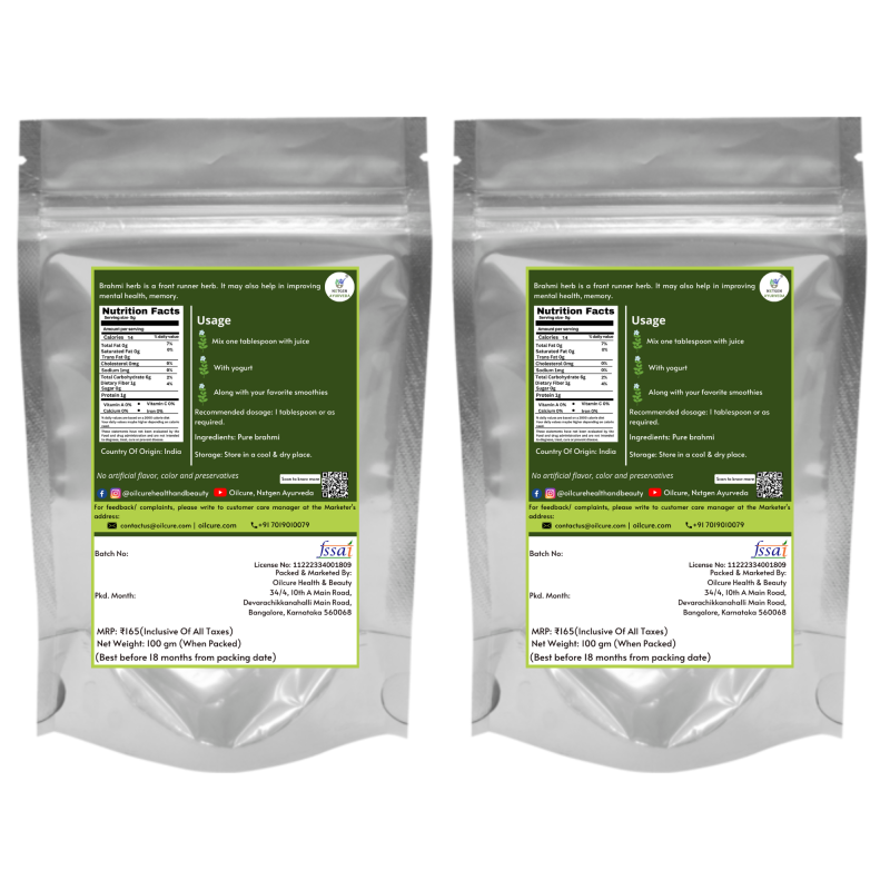 Unlock the potential of Brahmi Powder, derived from the revered Brahmi plant. This pure and finely ground powder is a treasure trove of natural goodness.