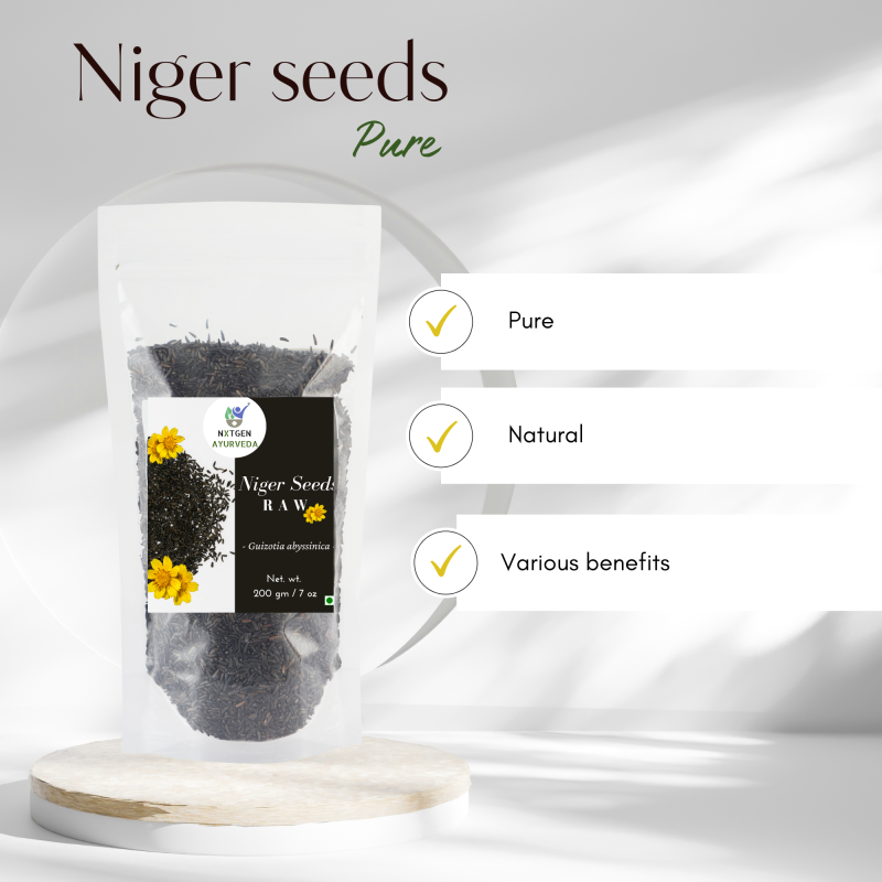 Niger seeds resemble sunflower seeds in shape, but are smaller in size and black. It bears a fairly thick, adherent seed coat. Niger seed contains proteins, oil and soluble sugars. Niger seeds are very popular for various health conditions.