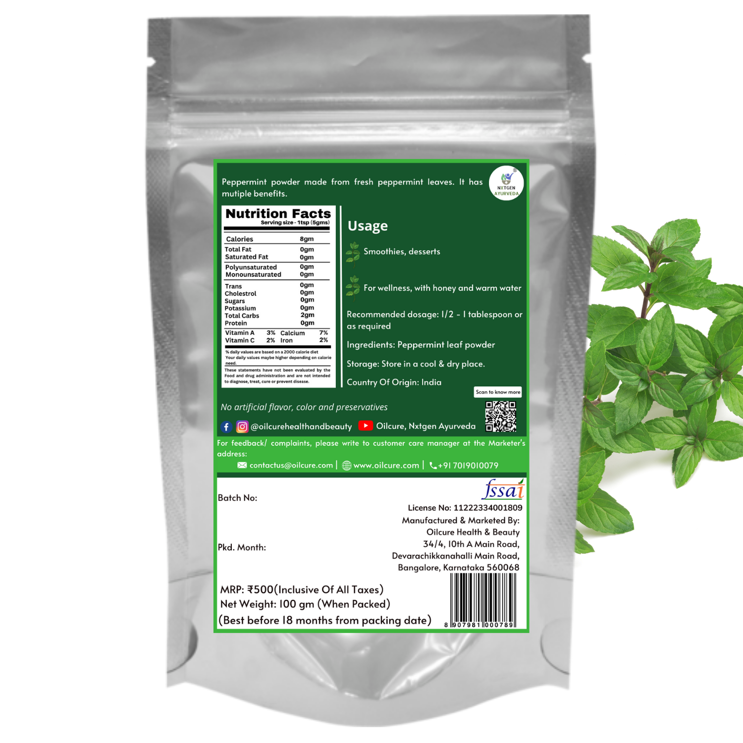 Nxtgen Peppermint leaves powder is an aromatic herb to give us a fresh and healthy feeling instantly. It is good for Irritable Bowel Syndrome (IBS), coughs, colds, asthma, allergies, tuberculosis, infantile colic, gastric trouble, and headaches associated with gas.