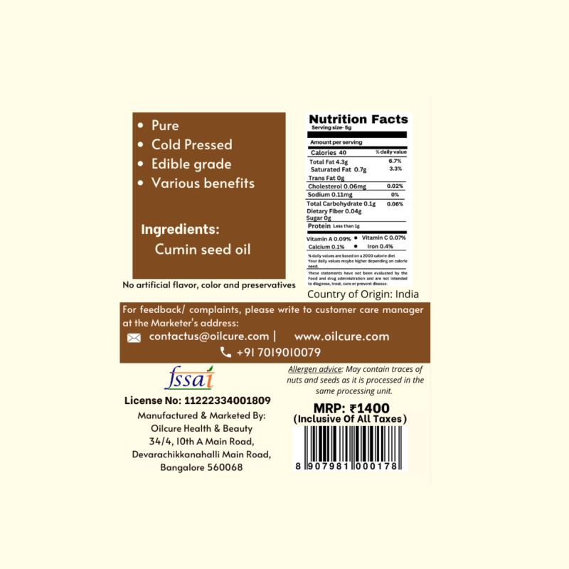 The health benefits of Jeera (cumin) oil include its ability to aid in digestion, Gastric trouble, improve immunity and piles, Obesity, insomnia, respiratory disorders, asthma, bronchitis, and common cold. It is great for weight loss.