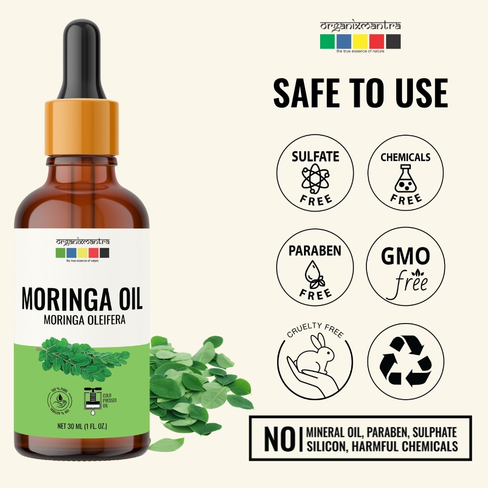 - ADDS A GLOW TO SKIN – Moringa Oil is known to have the ability to unclog the skin pores and balance the sebum secretion. Adding a couple of drops to your skin care lotion or moisturizer may help give a clear skin.