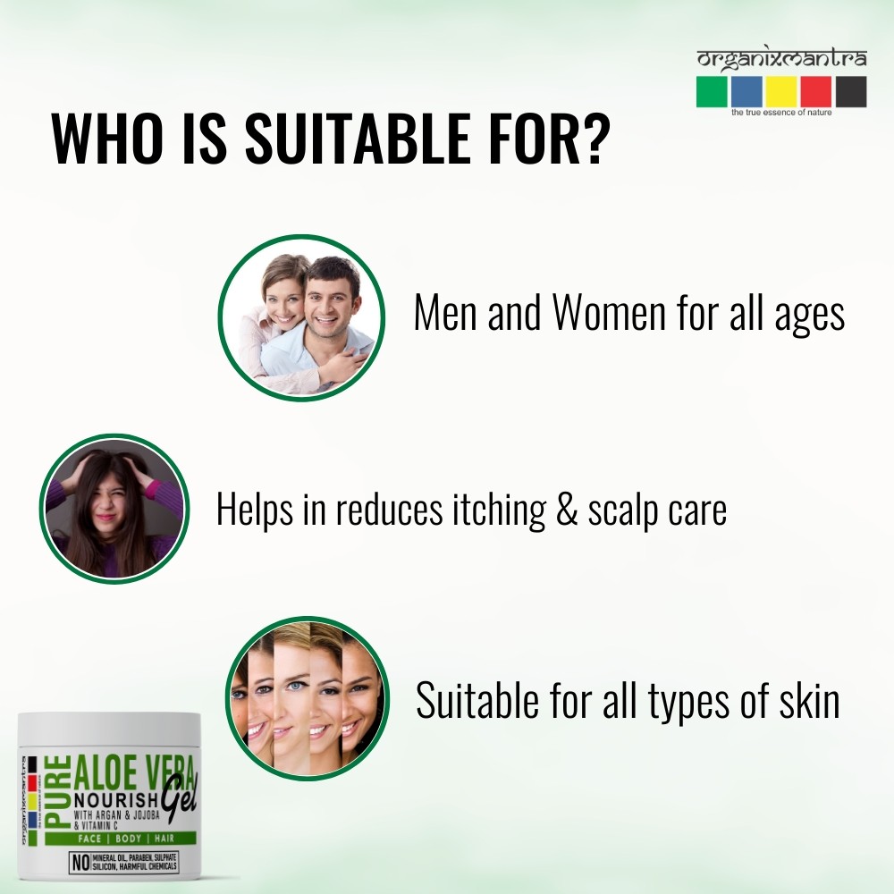 BENEFITS OF THE ALOE VERA GEL: Suitable for all skin types and deep nourishes the area where applied. Aloe Vera has healing and anti-inflammatory properties. Can do wonders for your skin. Women can use Aloe Vera gel post waxing, threading and shaving to soothe the skin. Men can use it as a soothing after-shave gel. Pamper your skin with Aloe Vera after a day out in the hot sun. It is excellent for aftersun skincare.