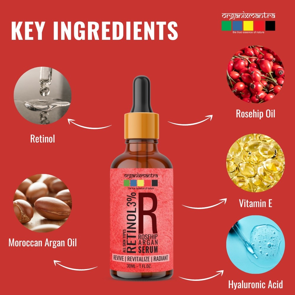 Retinol is a vitamin A derivative that is highly effective in reversing sun damage and signs of aging. Regularly applying Retinol serum is known to aid in cell turnover reduce fine lines, even skin color, improve texture, tighten pores, and stimulate collagen production. Organix Mantra Retinol 3% Serum for the face is a balanced blend of Vitamin E, Hyaluronic Acid, Moroccan Argan Oil, and Rosehip Oil.