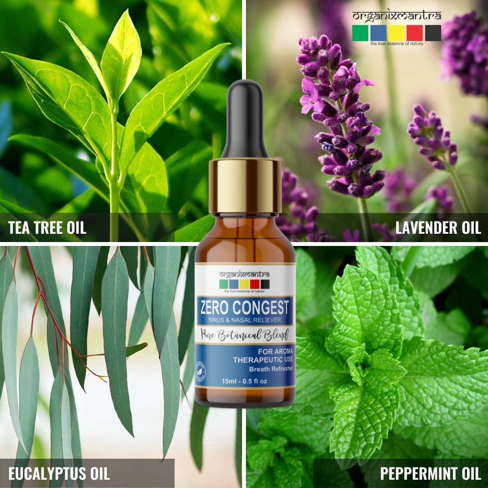 Aids in Sinus Relief: Tea Tree Oil, one of the main ingredients has anti-microbial properties is known to fight sinus. Inhaling the vapors of Zero congest helps to clear the blocked nose and nasal passageways.