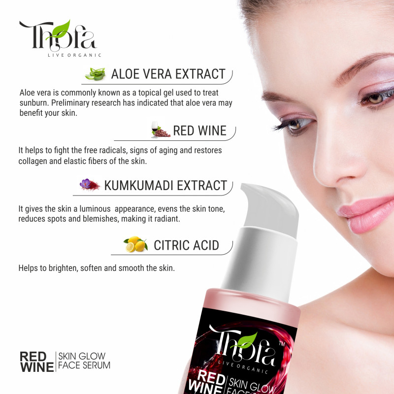 Thofa Red Wine Skin Glow Serum is well-known for its antiseptic, anti-bacterial and disinfectant properties. Apart from improving the skin complexion. Thofa Red Wine Skin Glow Serum is free of sulphates, silicones, parabens, and other harmful chemicals. Cruelty-free vegan. Thofa brand is always with nature and sources organic ingredients so that each product is crafted to perfection.
