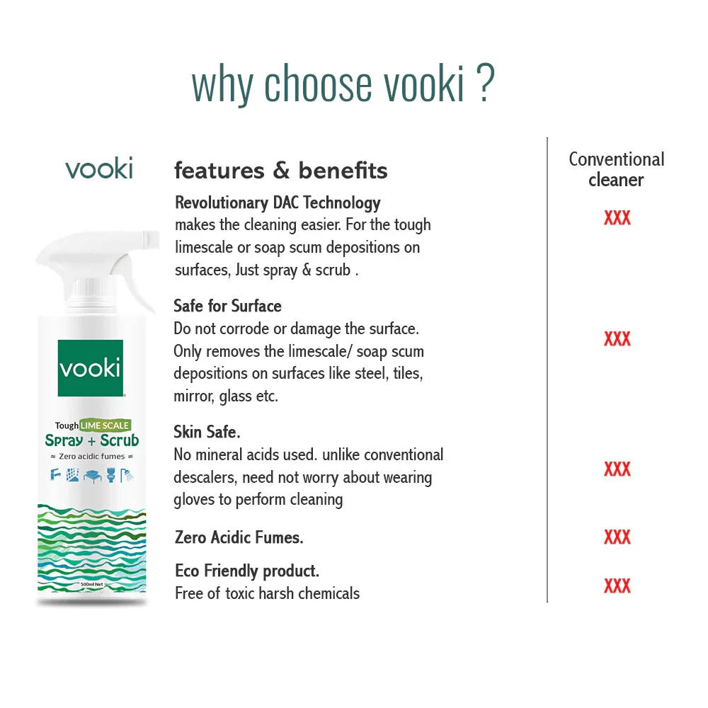 - • Unlike the mineral acids in conventional products, vooki products are made from earth friendly human safe ingredients.