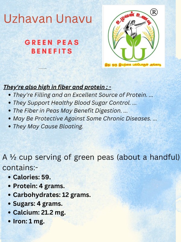 Uzhavan Unavu Dry Green Peas, also known as Pachai Pattani, are a versatile and nutritious addition to your pantry. Perfect for making curries, soups, and snacks, these peas are naturally sun-dried to retain their rich flavor and freshness. Ideal for a wholesome meal.