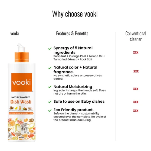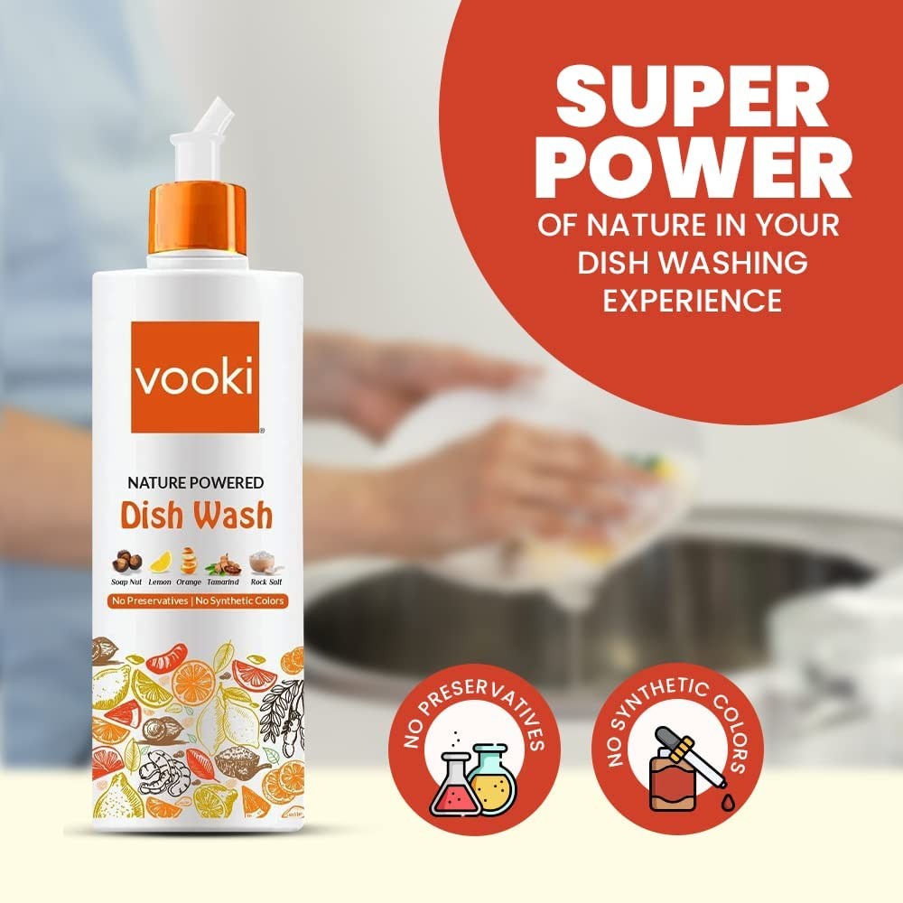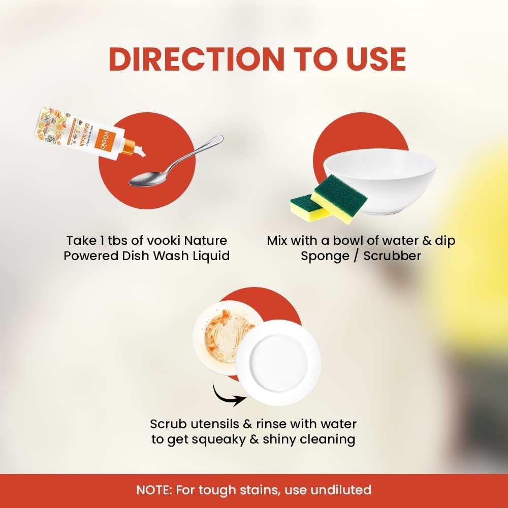 - Direction to use: Take 1 tbs of Vooki nature-powered dish wash liquid, Mix with a bowl of water & dip sponge/scrubber. Scrub utensils & rinse with water to get a squeaky & shiny cleaning.